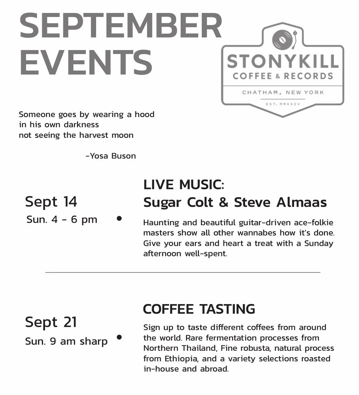 Stonykill Coffee & Records is a record and coffee shop in the village of Chatham, New York. Owned and run by locals, we bring refined aesthetic funkiness to Chatham's main street. Located on the second floor of 36 Main St. (above the People's Pub) we got coffee, tea, records, books, tapes, and all other types of treasures. Stop in for a cortado or a coldbrew and buy a record, why don't ya?!